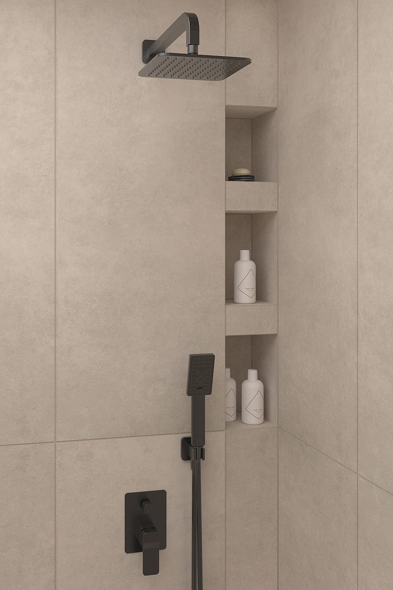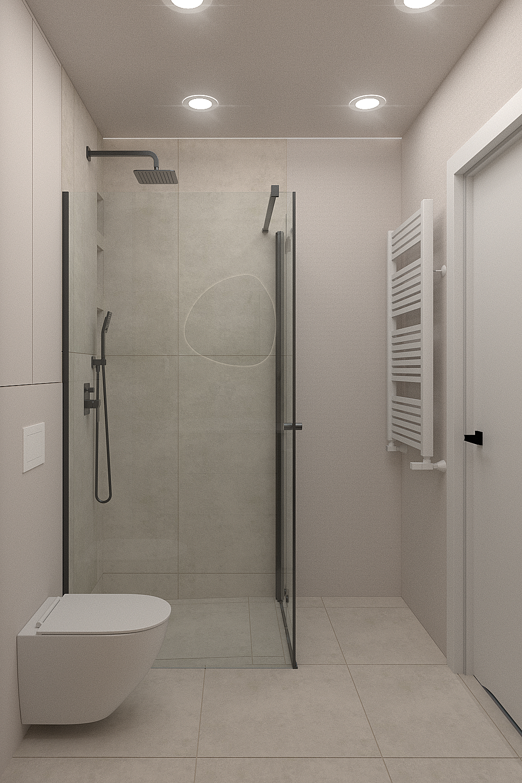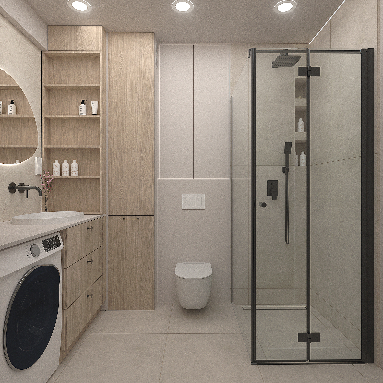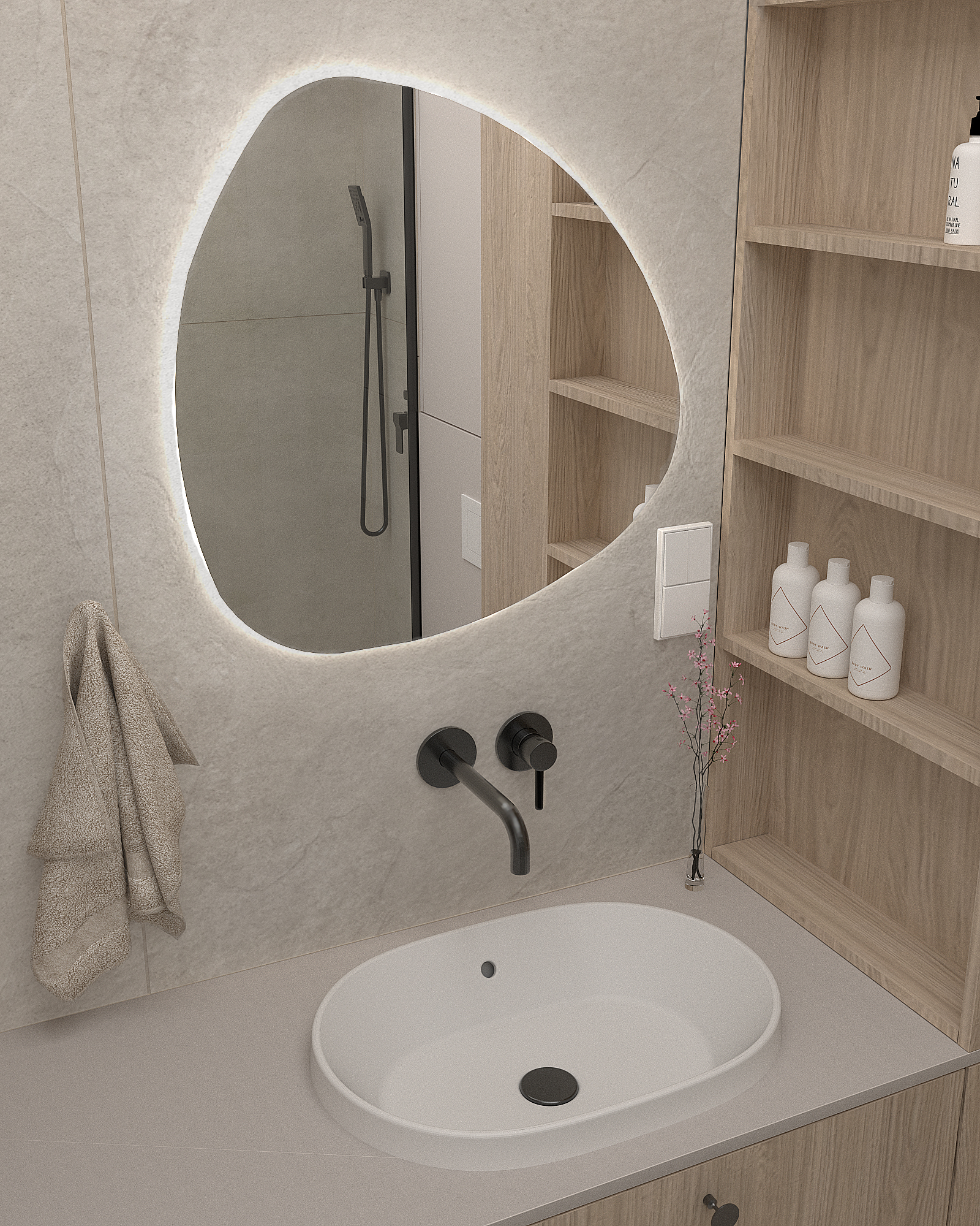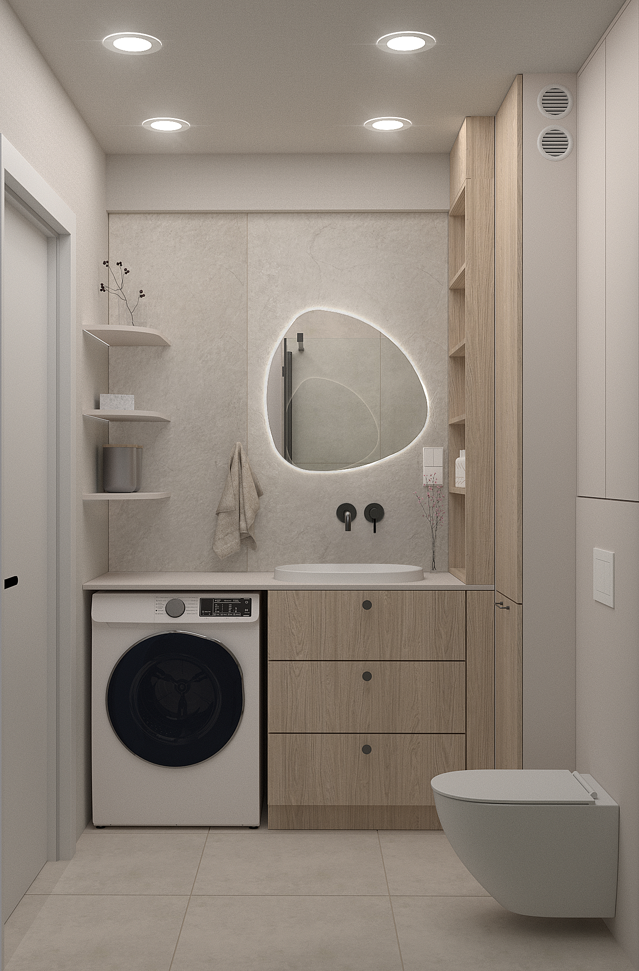 Jasna baza, drewniana faktura i płytki imitujące kamień budują tło inspirowane naturą – miękkie, nienachalne i ponadczasowe. Obłe, nieregularne lustro z delikatnym podświetleniem wprowadza organiczny akcent i przełamuje prostą linię zabudowy. 🕊 Przy szafce umywalkowej zaprojektowany został wysoki pion z półkami na kosmetyki oraz zabudowa z ukrytym koszem na pranie. Dzięki temu przestrzeń, mimo obecności wszystkich wymaganych funkcji, pozostaje uporządkowana i wizualnie lekka. ✨