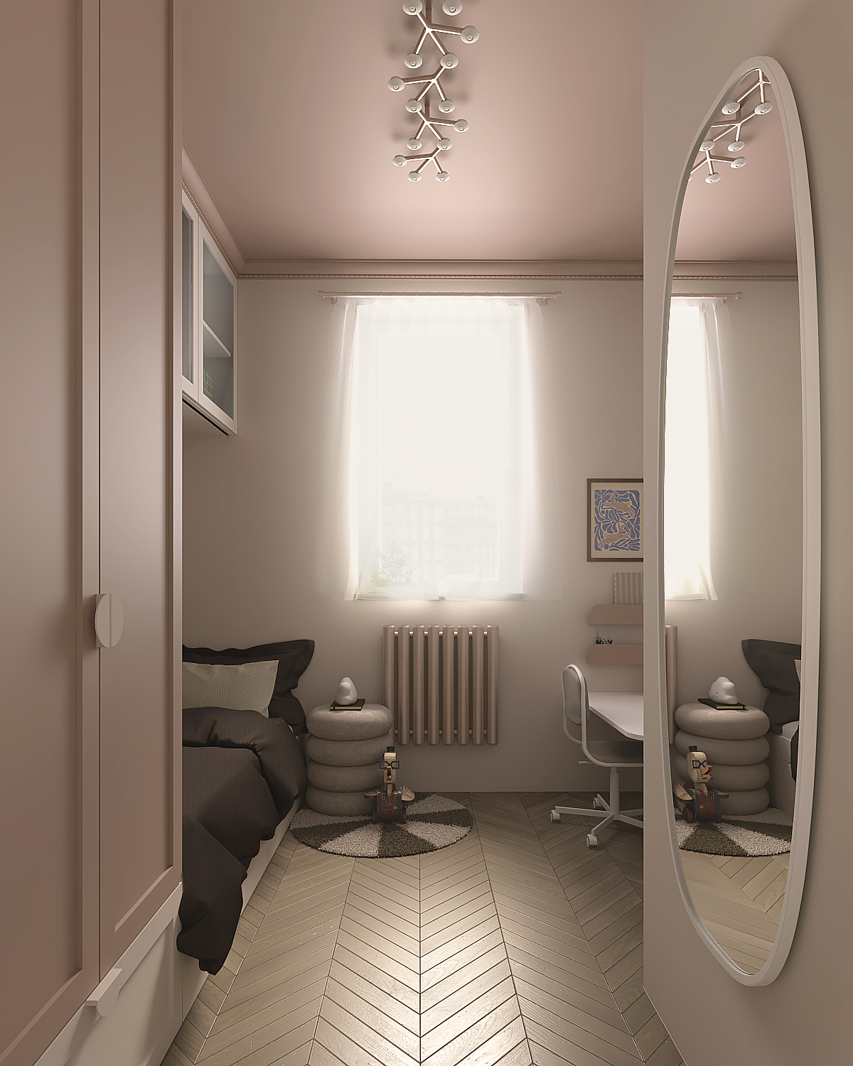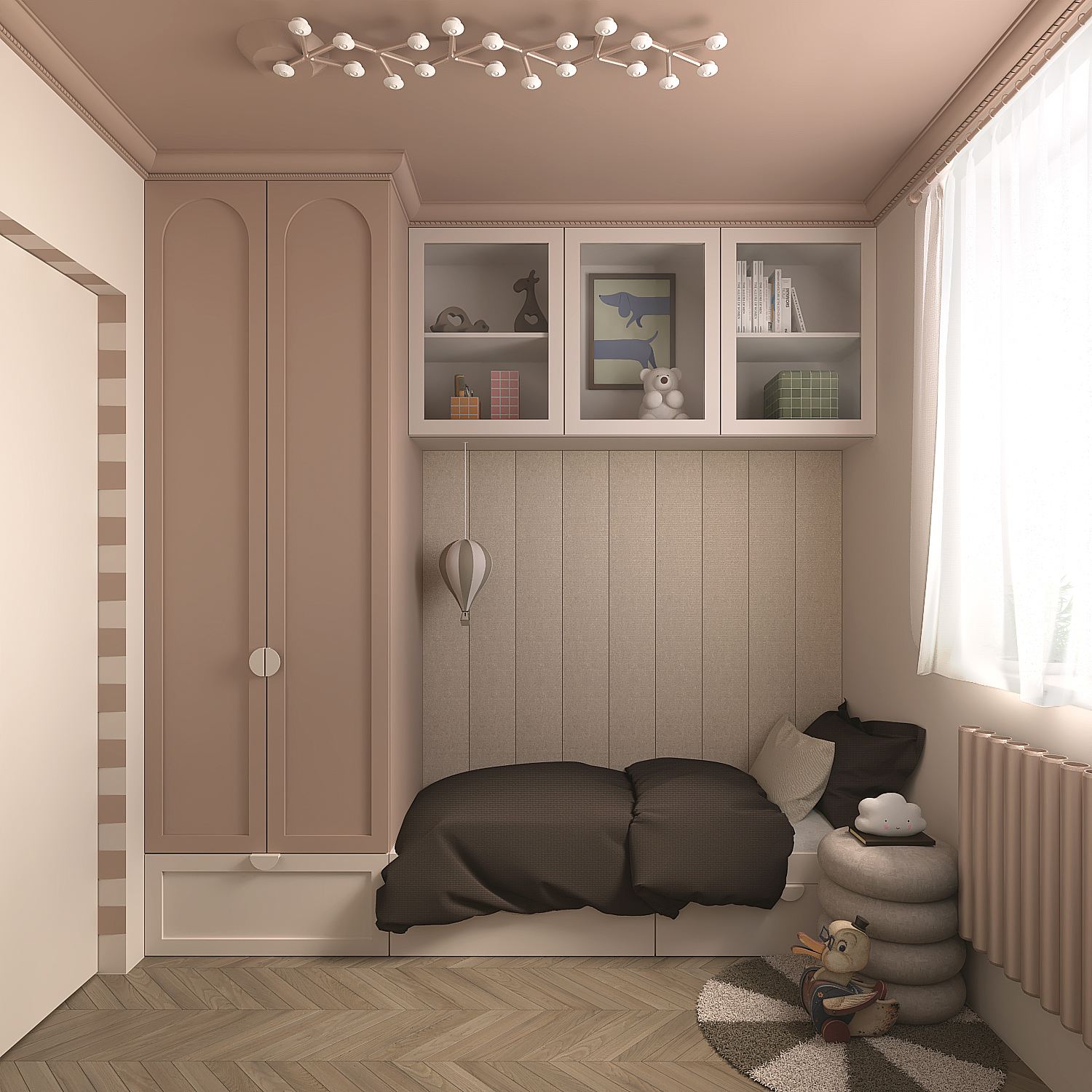 Projekt pokoju dziecięcego, 6,5 m2. 💜 W tej niewielkiej przestrzeni miękkie kolory i subtelne detale tworzą spokojny świat do odpoczynku i zabawy. ✨ Pudrowy sufit ociepla wnętrze, a harmonijne beże i zaokrąglone formy mebli dodają mu przytulności, której szuka się zwłaszcza w dziecięcej przestrzeni. 🌈 Tu wszystko ma swoje miejsce — kącik do rysowania, wygodne łóżko, praktyczne zabudowy i małe elementy, które cieszą oko. Wnętrze, które rośnie razem z dzieckiem i zostawia miejsce na jego własną historię. 🧚‍♀️